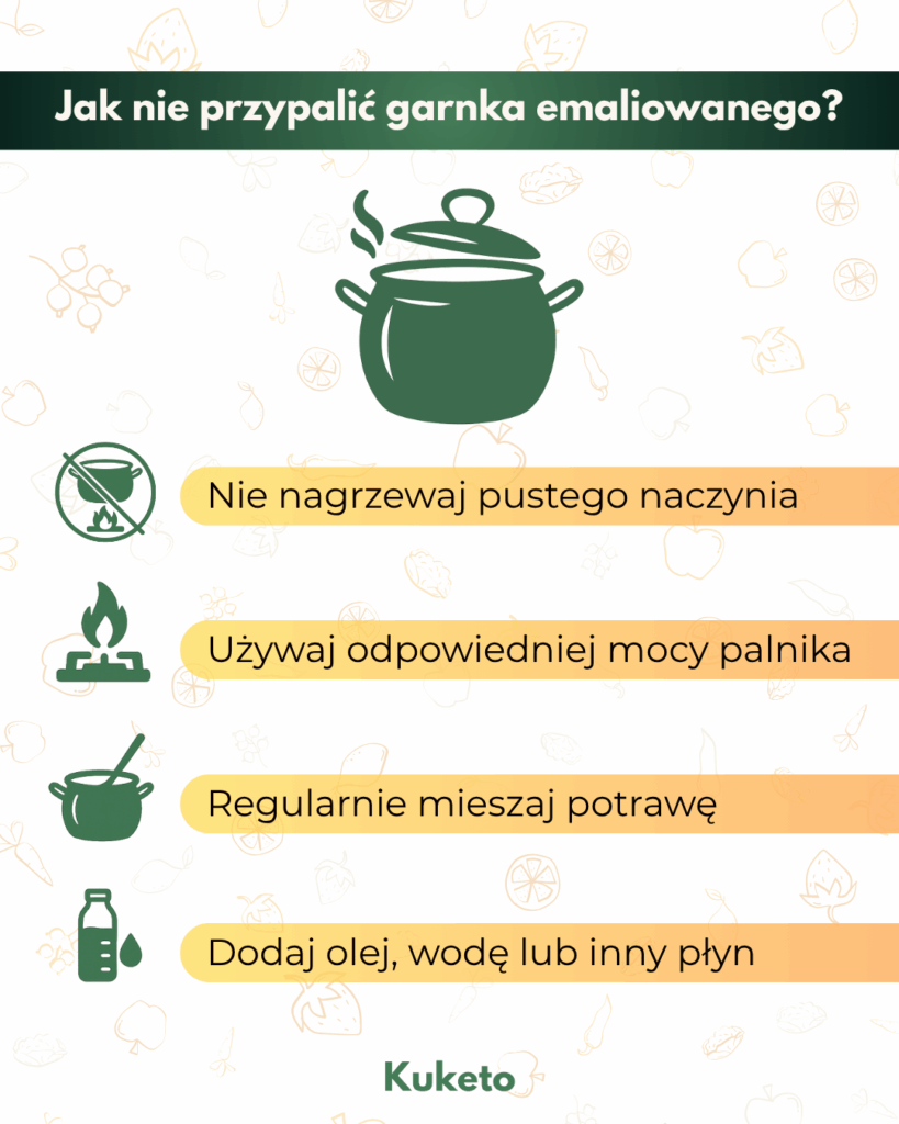Emalia nie jest typową powłoką nieprzywierającą, ale dzięki jej gładkości przy odpowiedniej technice gotowania potrawy nie będą przywierać ani się przypalać. Kilka praktycznych wskazówek: