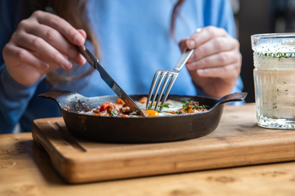 2. Zawsze odpowiednio rozgrzewaj patelnię i używaj odrobiny tłuszczu. Zimna patelnia żeliwna spowoduje przywieranie nawet dobrze przyprawionej powierzchni. Dlatego przed smażeniem rozgrzej patelnię przez kilka minut, dodaj niewielką ilość oleju lub masła, i dopiero kładź produkty na ruszt. Przy dobrze rozgrzanym i natłuszczonym żeliwie potrawy powinny łatwo odchodzić od dna. Pamiętaj, że chudsze i delikatniejsze produkty (np. jajka, chude mięso) zawsze warto smażyć z odrobiną tłuszczu – żeliwo to nie teflon i całkowicie beztłuszczowe smażenie może skutkować przywieraniem (więcej o tym zagadnieniu w jednym z kolejnych pytań).