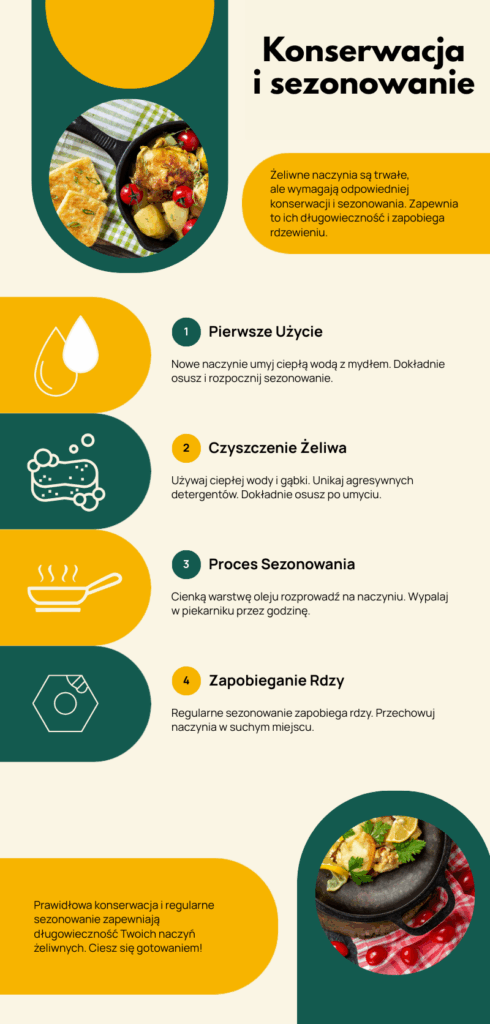 Konserwacja żeliwa sprowadza się do czterech podstawowych czynności: (1) odpowiedniego sezonowania (wypalania), (2) regularnego czyszczenia, (3) właściwego przechowywania, (4) ponownego sezonowania w razie potrzeby. Omówiliśmy już wiele aspektów przy okazji poprzednich pytań – tutaj zbierzemy najważniejsze zasady prawidłowej pielęgnacji patelni i garnków żeliwnych: