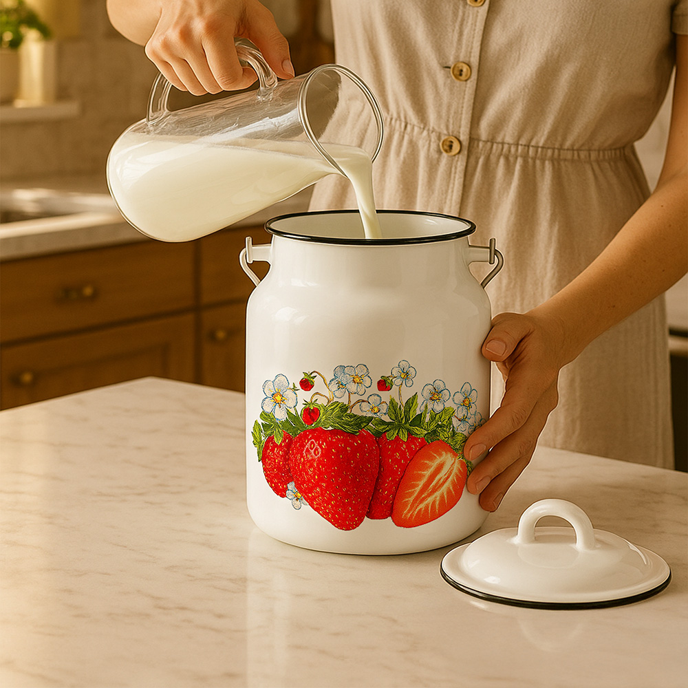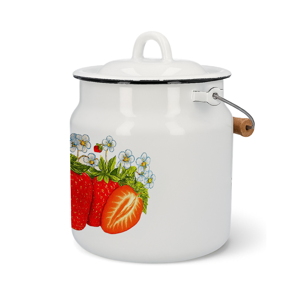 Motyw czerwonych poziomek na białym tle nadaje bańce wyjątkowego charakteru i przytulnego wyglądu. Czarny rant subtelnie podkreśla klasyczną formę naczynia, a całość świetnie komponuje się z kuchnią tradycyjną, wiejską lub vintage. Dzięki temu bańka może pełnić również funkcję dekoracyjną, stojąc na widoku na półce lub blacie.