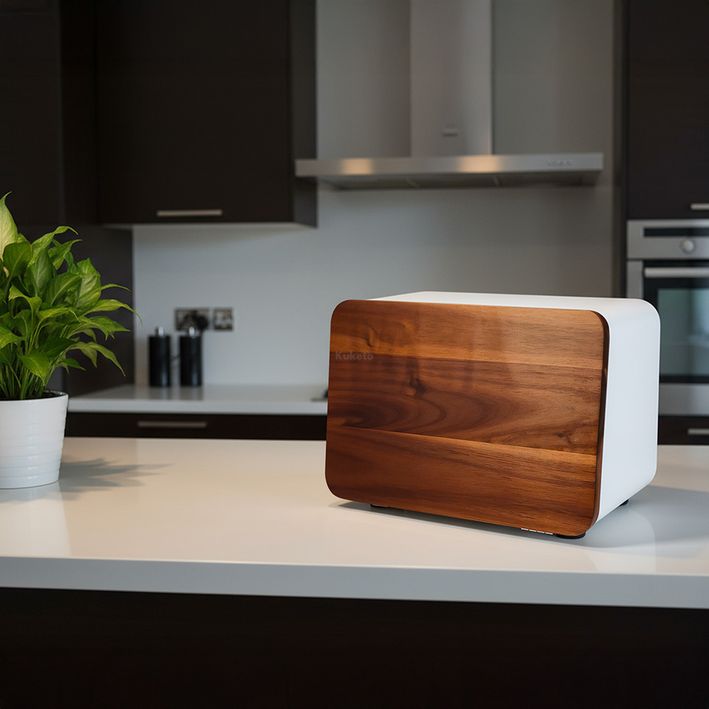 Elegancja chlebaka Husla przejawia się w harmonijnym połączeniu białej stali nierdzewnej i naturalnego drewna akacjowego. Takie zestawienie tworzy wyjątkowy kontrast, który przyciąga wzrok i nadaje kuchni stylu glamour. Mimo swojego nowoczesnego wyglądu, chlebak emanuje prostotą, co sprawia, że pasuje do różnych stylów aranżacji wnętrz. Można go umieścić zarówno w minimalistycznej, jak i bardziej klasycznej kuchni, a zawsze będzie wyglądał dobrze. Drewniana pokrywa, oprócz pełnienia funkcji deski do krojenia, podkreśla ekologiczny charakter produktu. Drewno akacjowe to naturalny i trwały surowiec, co jest ważnym aspektem dla osób dbających o środowisko.