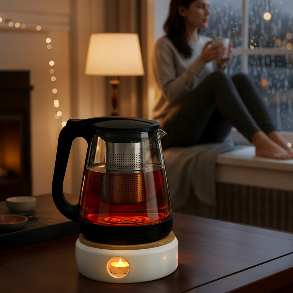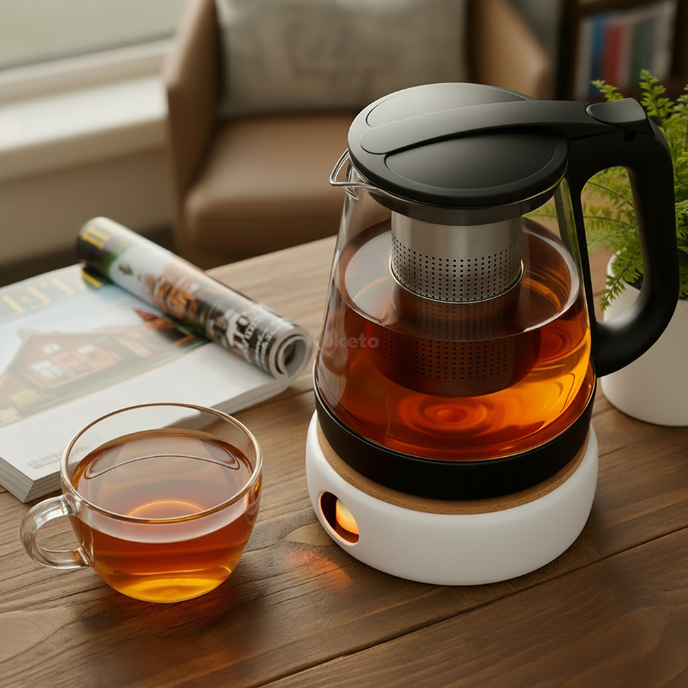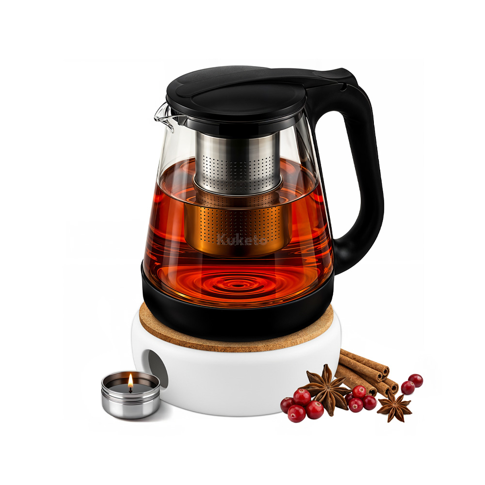 Dzbanek szklany Etna 2200ml z zaparzaczem i ceramicznym podgrzewaczem Kuketo to praktyczny zestaw do codziennego parzenia herbaty i naparów. Już przy pierwszym użyciu zachwyca wygodą, a także eleganckim wyglądem. Co więcej, przezroczyste szkło pozwala obserwować proces parzenia, natomiast stalowy zaparzacz wydobywa intensywny smak ulubionych liści. Ceramiczny podgrzewacz utrzymuje ciepło przez długi czas, dzięki czemu możesz cieszyć się napojem bez pośpiechu.
