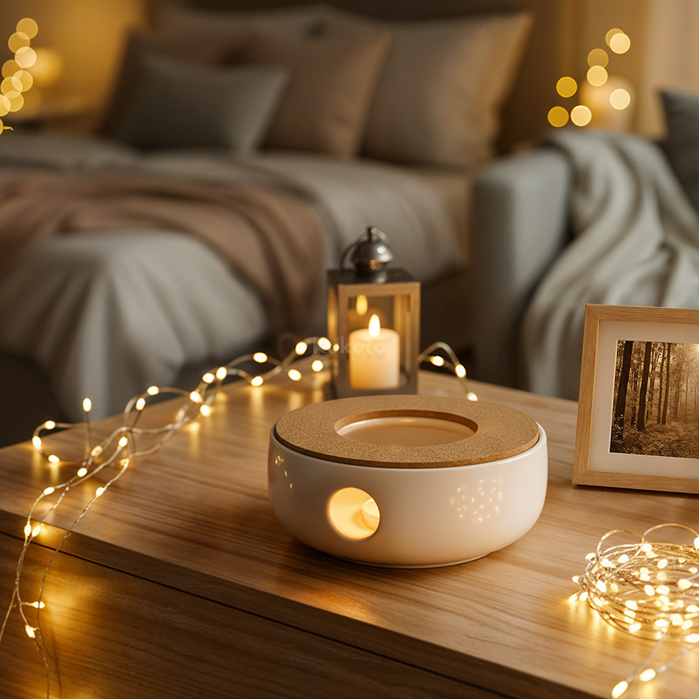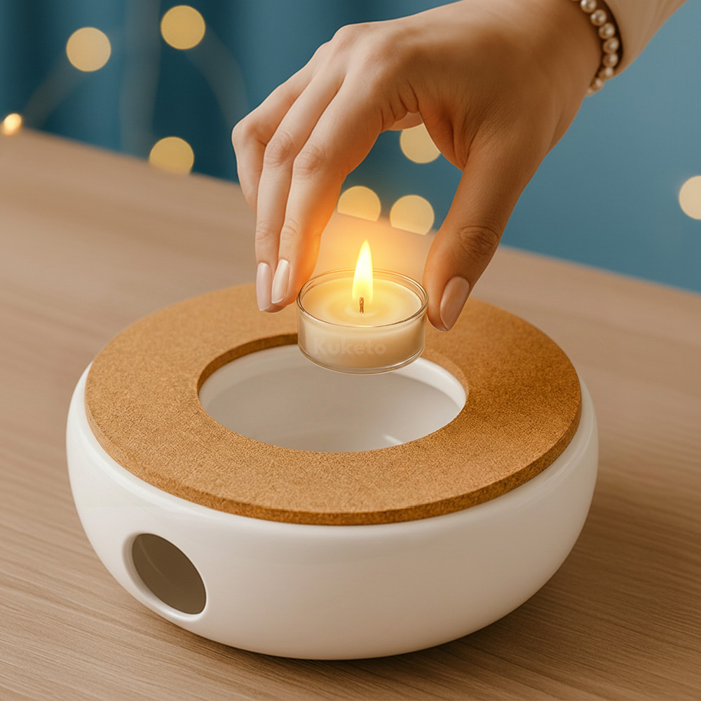 Do zestawu dołączono ceramiczny podgrzewacz, który zapewnia równomierne i delikatne ogrzewanie dna dzbanka. Wystarczy włożyć świeczkę tealight, aby napój pozostał ciepły przez długi czas. Ponadto ceramika jest stabilna i odporna na wysokie temperatury, co zwiększa bezpieczeństwo podczas użytkowania. Minimalistyczny design idealnie uzupełnia wygląd dzbanka, a jednocześnie tworzy przytulny, nastrojowy efekt świetlny.