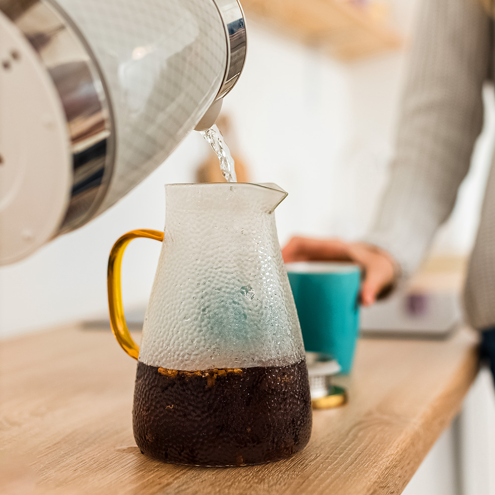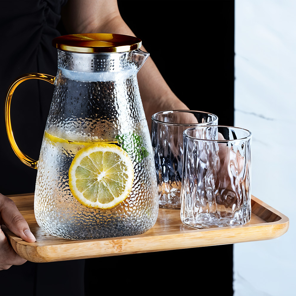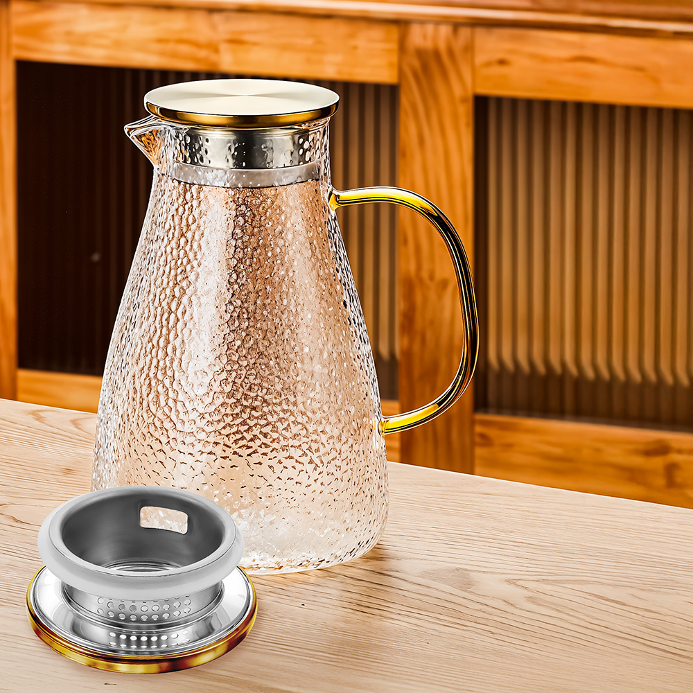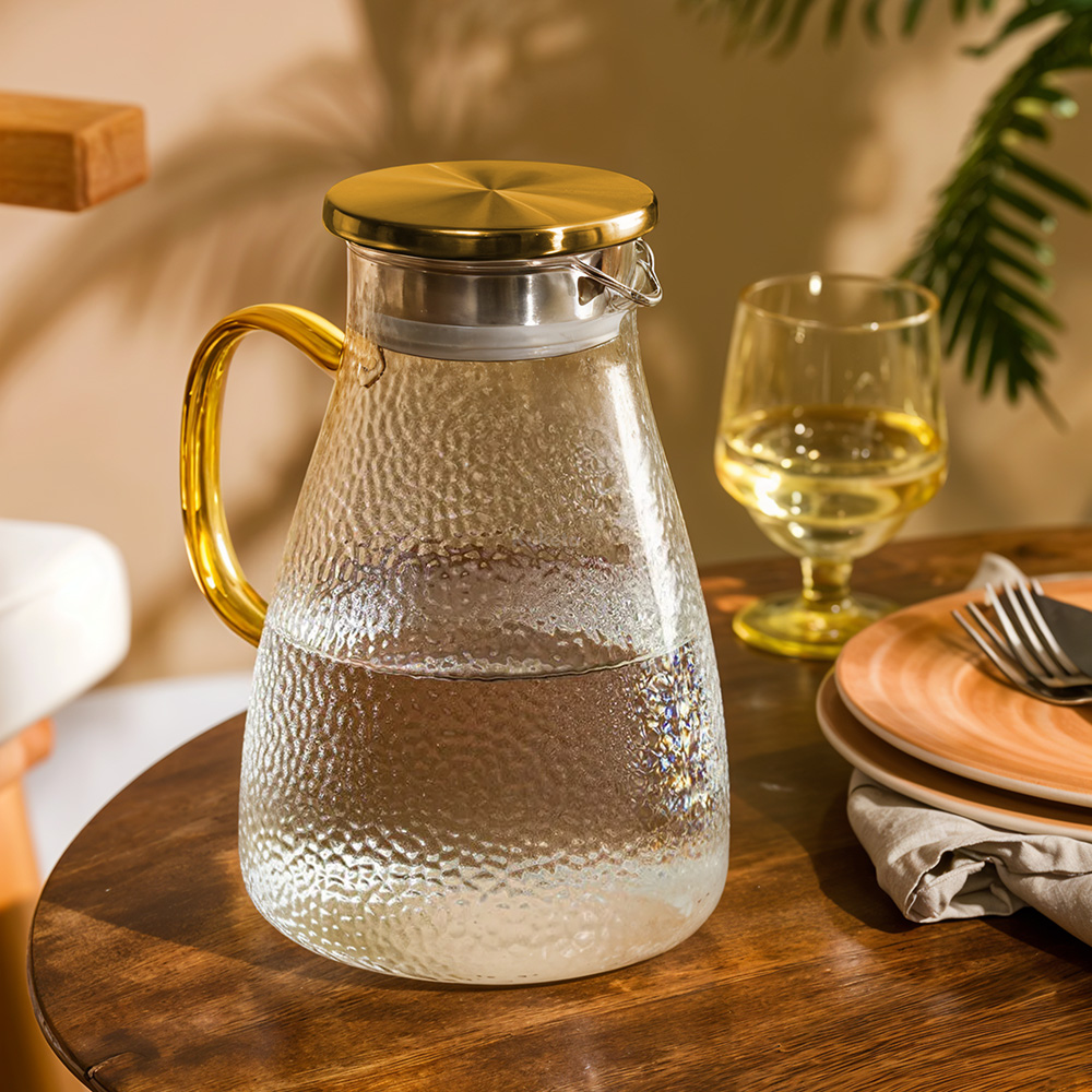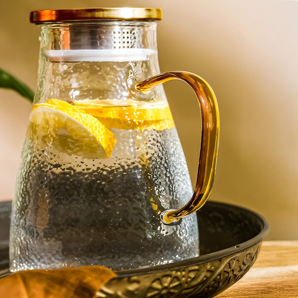 Elegancki dzbanek szklany Kuketo zachwyca detalami – od złotego uchwytu, przez stalową pokrywkę z filtrem, aż po szeroki otwór wlewowy, który umożliwia łatwe dodawanie lodu, plastrów cytrusów i ziół. Co więcej, dzięki przemyślanej konstrukcji możesz jednym ruchem obrócić pokrywkę i wybrać tryb nalewania: z sitkiem lub klasyczny strumień. To rozwiązanie sprawia, że dzbanek świetnie sprawdza się przy serwowaniu herbaty liściastej, lemoniady z dodatkami czy nawet domowych kompotów. Szklane ścianki umożliwiają podgląd zawartości, co dodaje wizualnego uroku każdemu napojowi. Minimalistyczna forma łączy się tu z maksymalną funkcjonalnością – to naczynie, które chce się postawić na stole nawet bez okazji.
