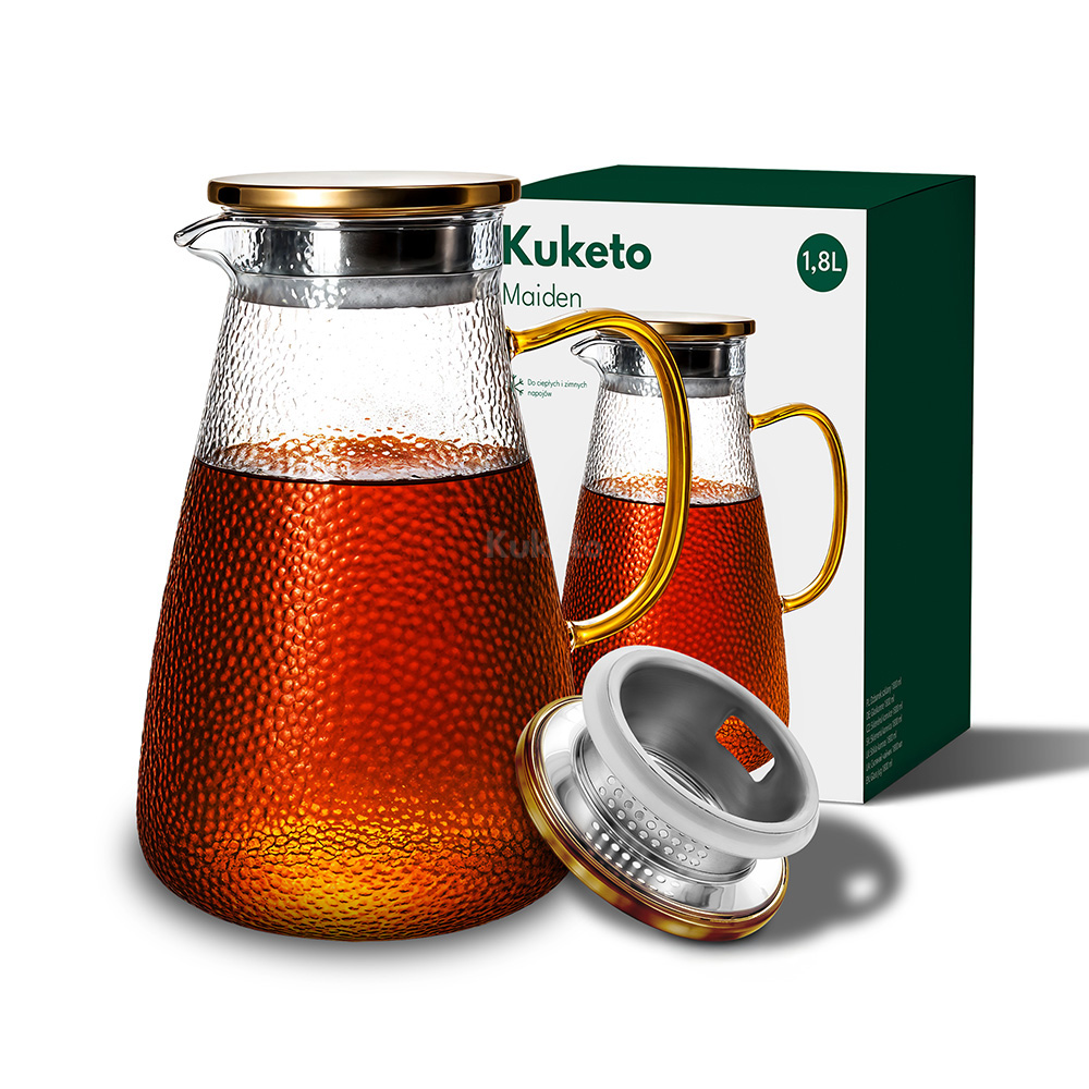 Dzbanek szklany Kuketo o pojemności 1,8 litra to eleganckie połączenie funkcjonalności i stylu. Wykonany z trwałego szkła borokrzemowego, doskonale sprawdza się do serwowania zarówno gorącej herbaty, jak i zimnej lemoniady czy wody z owocami. W zestawie znajduje się wygodna pokrywka z filtrem oraz estetyczny uchwyt w kolorze złota,. Ta estetyka przyciąga wzrok i zapewnia wygodne nalewanie. Dzbanek nie tylko pięknie wygląda na stole, ale także ułatwia codzienne przygotowanie napojów, eliminując potrzebę korzystania z kilku naczyń. To doskonały wybór dla osób, które cenią praktyczne rozwiązania w eleganckim wydaniu. Świetnie sprawdzi się w kuchni, salonie i podczas rodzinnych spotkań.