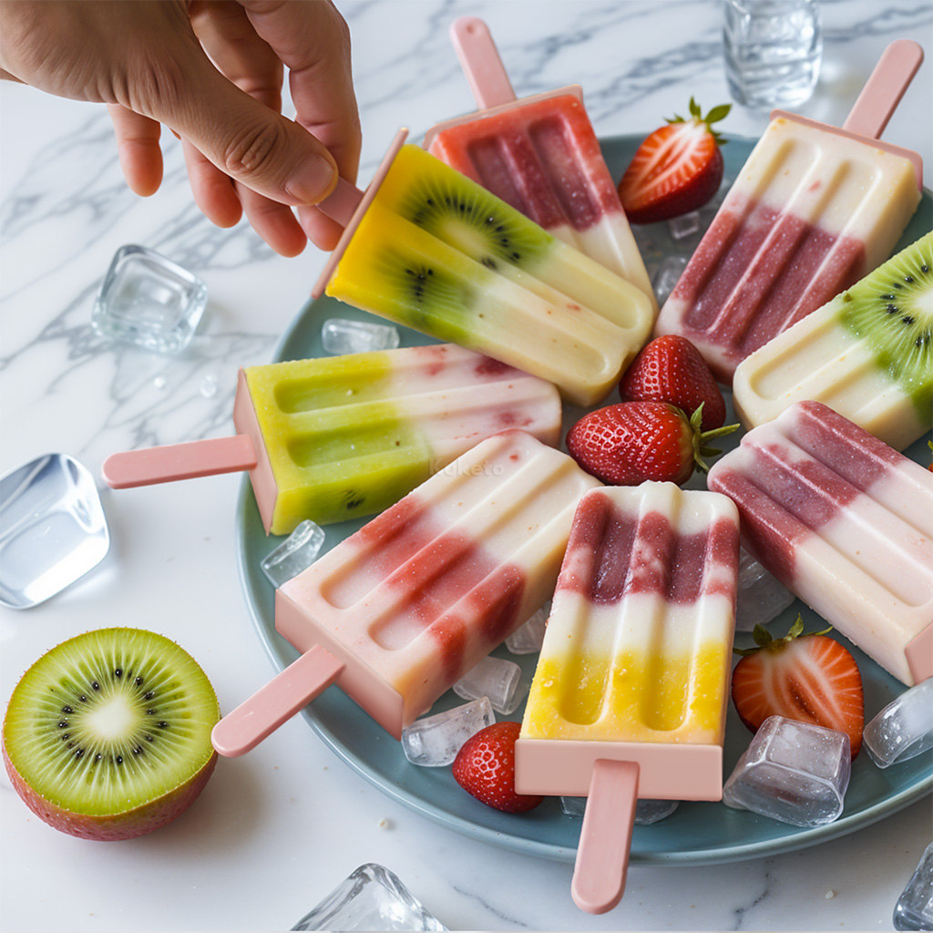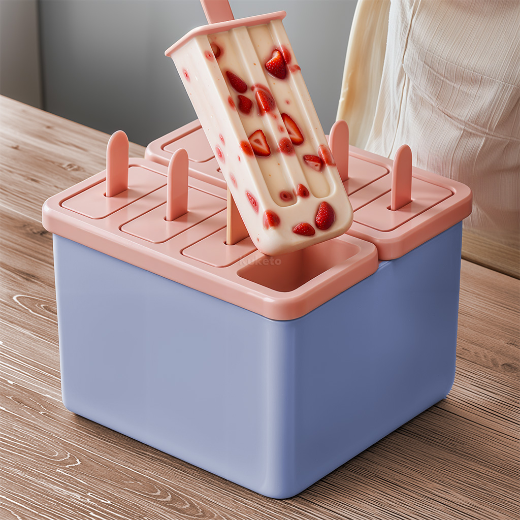 Dzięki przemyślanej konstrukcji, foremka na domowe lody na patyku Kuketo gwarantuje wygodę i doskonały efekt. Pokrywki są szczelne, więc masa lodowa nie rozlewa się przed zamrożeniem, a patyczki z otworami lepiej „łapią” lód. To z kolei zapobiega zsuwaniu się go po wyjęciu. Forma jest wykonana z bezpiecznego tworzywa, wolnego od BPA, które nie wpływa na smak. Jest łatwa do czyszczenia i wielokrotnego użytku – dzięki temu nie generujesz niepotrzebnych odpadów. Możesz tworzyć warstwowe, kolorowe kompozycje i bawić się smakami – to świetna zabawa dla całej rodziny.