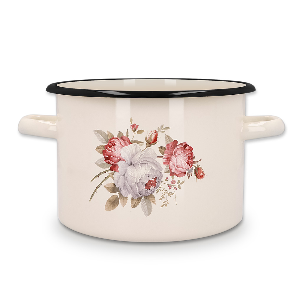 Garnek emaliowany 3l Krem Róża 18 cm od marki Naczynia Olkusz to wyjątkowe połączenie klasyki z funkcjonalnością. Jego kremowy odcień doskonale współgra z romantycznym motywem róż. Przyciąga on wzrok i przywołuje ciepłe wspomnienia rodzinnych obiadów i kuchni naszych babć. Subtelny, kwiatowy wzór w stylu retro sprawia, że garnek pełni nie tylko funkcję użytkową, ale staje się również estetycznym elementem wystroju kuchni. To naczynie, które zachwyca zarówno w codziennym użytkowaniu, jak i jako ozdoba postawiona na otwartej półce czy stole.