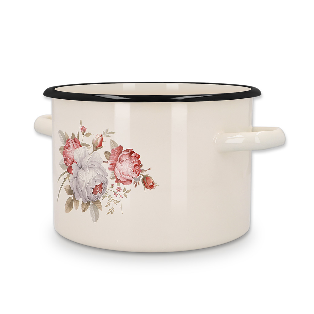 Garnek emaliowany 4,5 l Krem Róża 20 cm od marki Naczynia Olkusz to harmonijne połączenie klasycznego stylu z codzienną praktycznością. Jego kremowe tło w połączeniu z subtelnym motywem róż przywodzi na myśl ciepło rodzinnego domu i tradycyjną, domową kuchnię. Wzór w stylu retro, pełen delikatnych kwiatów, nie tylko urozmaica wnętrze kuchni. Równocześnie sprawia, że naczynie może pełnić funkcję dekoracyjną. To garnek, który równie dobrze wygląda na kuchence, jak i na kuchennej półce, budując atmosferę przytulności.