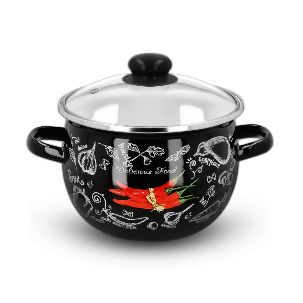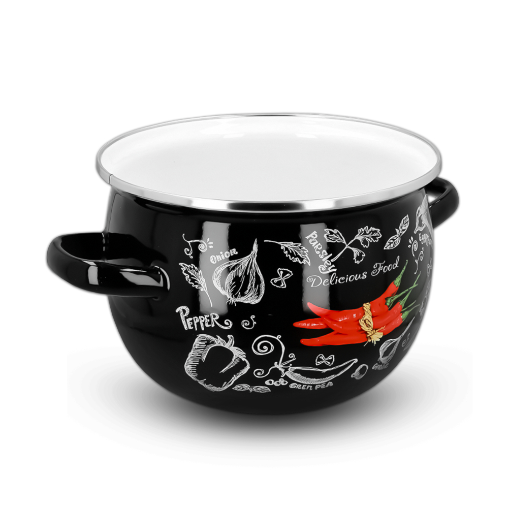 Komplet garnków emaliowanych czarny SPICY od marki Emajlo Olkusz to nieodzowny element każdej dobrze wyposażonej kuchni. Zestaw składa się z czterech garnków o pojemnościach 1,5 l, 2,5 l, 3,5 l oraz 5,0 l, które są nie tylko solidne, ale też odporne na działanie kwasów, prozdrowotne i antyalergiczne. Można w nich gotować i przechowywać nawet tradycyjne, kwaśne potrawy bez żadnych obaw. Co więcej, wyróżniają się estetycznym motywem soczyście czerwonych papryczek chili w towarzystwie innych warzyw. Ich design łączy estetykę retro z nowoczesnym wydaniem, co nadaje im niezwykły urok i sprawia, że prezentują się niezwykle apetycznie. Ten komplet garnków emaliowanych z pokrywkami, z czerwonymi, bakelitowymi uchwytami na pewno ożywi Twoją kuchnię!