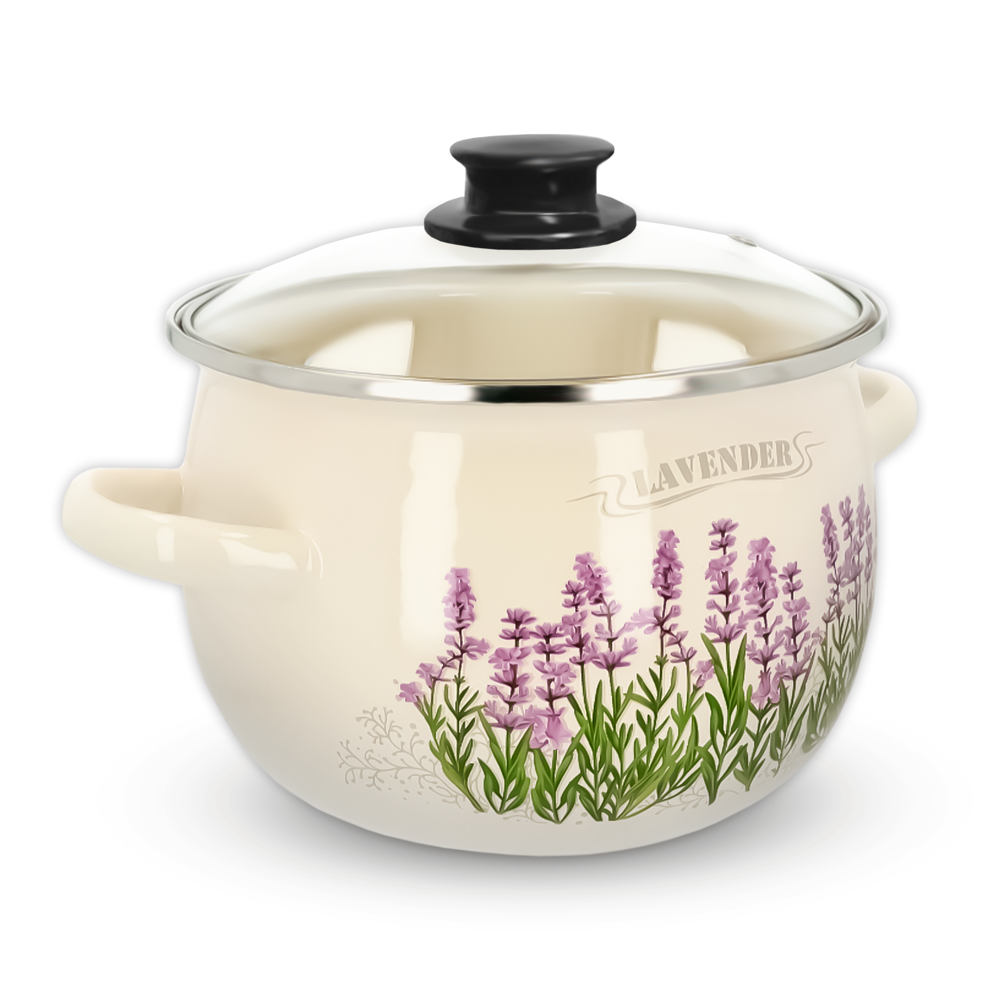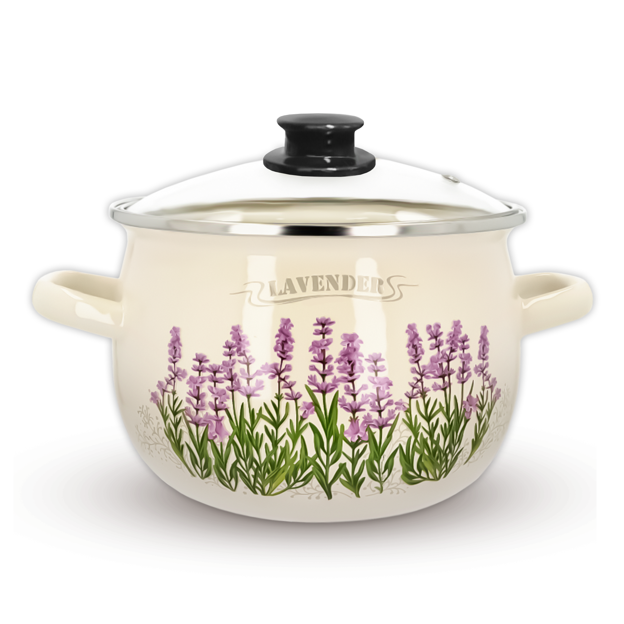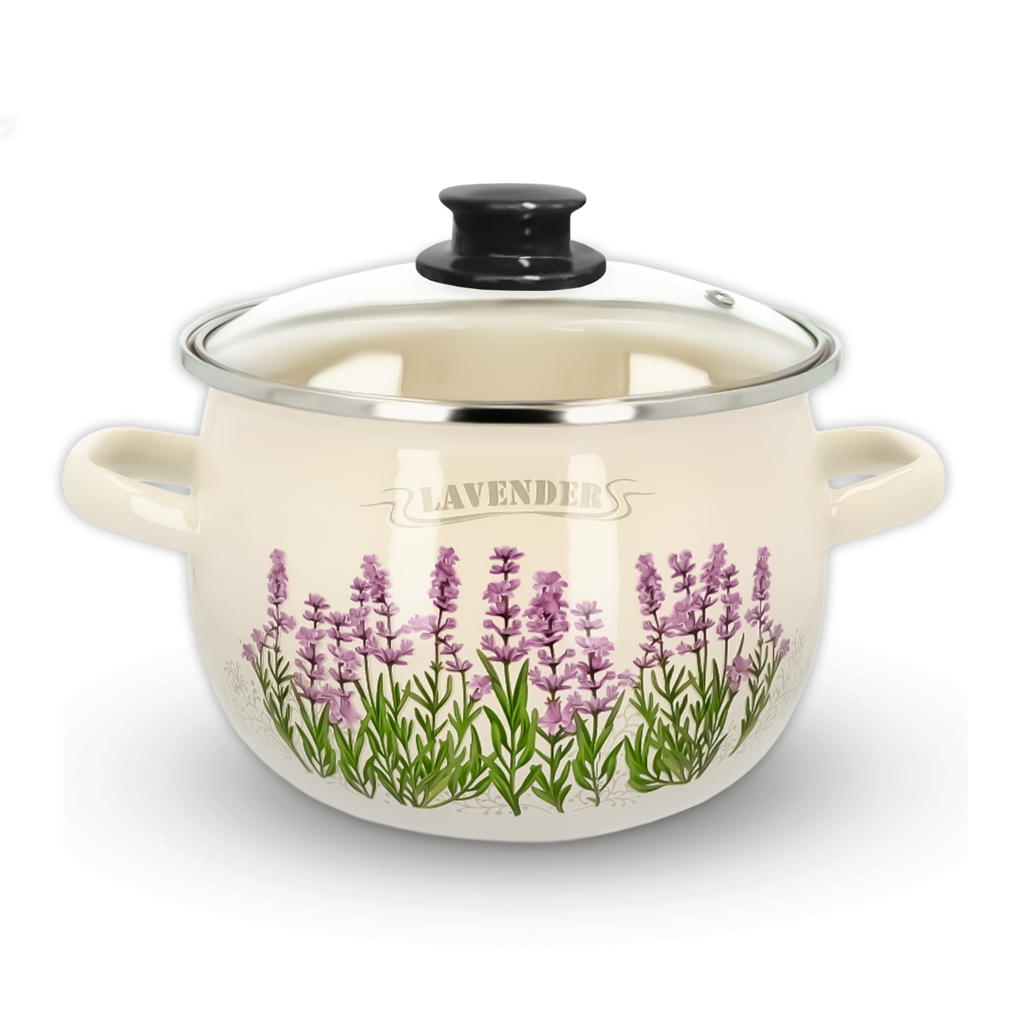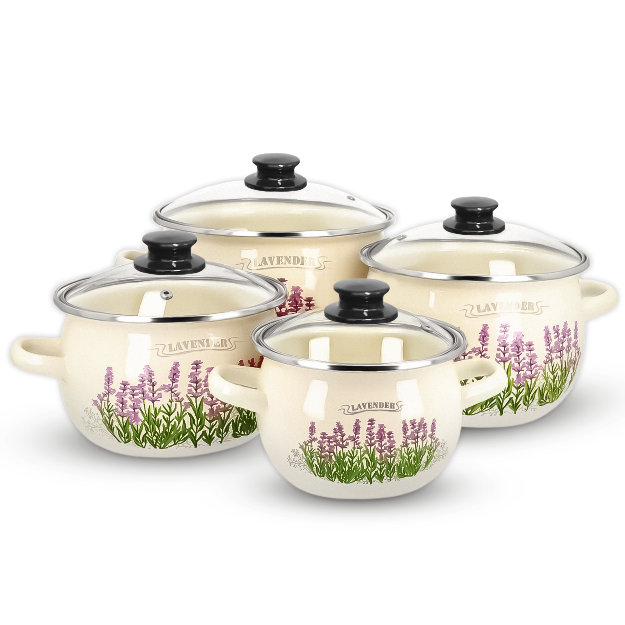 Praktyczny komplet garnków emaliowanych z pokrywkami – cztery garnki o poj. 1,5l, 2,5 l, 3,5l oraz 5,0l. Są niezastąpione w każdej dobrze wyposażonej kuchni! Te tradycyjne, dobre garnki ze szklanymi pokrywkami o pięknym designie, ozdobione lawendowym motywem, zachwycają swoją estetyką.