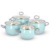 Komplet garnków emaliowanych pastel zielony 4 el. Naczynia Olkusz to praktyczny zestaw, który doskonale odnajdzie się w każdej kuchni. W zestawie znajdują się cztery solidne garnki o pojemnościach: 1,5 l, 2,5 l, 3,5 l oraz 5,0 l, każdy z nich wyposażony w szklaną pokrywkę z odpowietrznikiem. Garnki wyróżniają się pięknym, klasycznym designem oraz delikatnym, pastelowym zielonym kolorem, który wprowadza świeżość do wnętrza kuchni. Emaliowane naczynia są wszechstronne, umożliwiając ich stosowanie na kuchenkach gazowych, elektrycznych, ceramicznych oraz indukcyjnych. W dodatku powłoka emaliowana, wypalana w wysokich temperaturach, nie uwalnia szkodliwych substancji. To z kolei czyni je idealnym wyborem dla osób z alergiami.