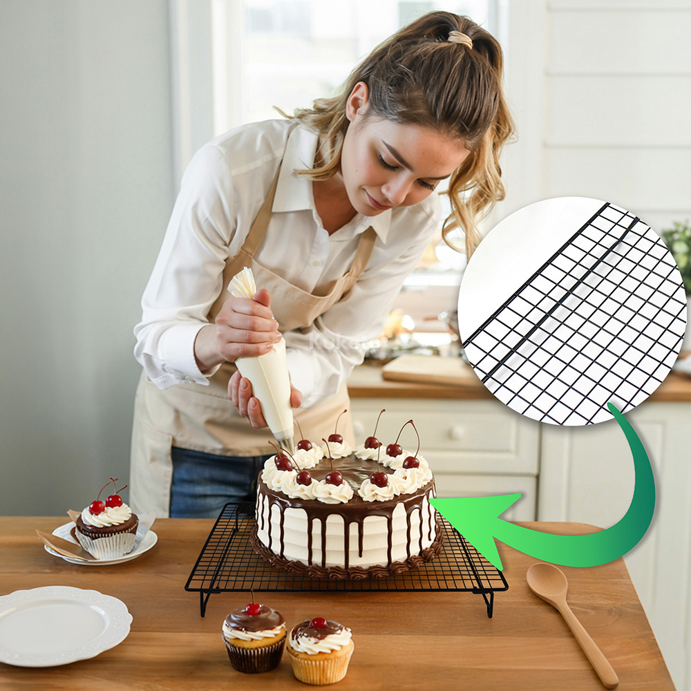 Kratka do lukrowania Kuketo pozwala wygodnie dekorować domowe wypieki. Przede wszystkim umożliwia precyzyjne nakładanie lukru, polewy lub czekolady na ciasta, ciasteczka i babeczki. Dzięki odpowiedniej wysokości nóżek nadmiar polewy swobodnie spływa, a wypieki zyskują estetyczne wykończenie. Co więcej, kratka ułatwia przygotowanie domowych pralin oraz innych słodkich deserów. W rezultacie praca przebiega sprawniej i bez zbędnego bałaganu. Ponadto kratka sprawdza się podczas suszenia pierniczków oraz studzenia korzennych ciasteczek, pomagając zachować ich idealną konsystencję. Ostatecznie użytkownik zyskuje praktyczne narzędzie, które łączy funkcjonalność z estetyką.