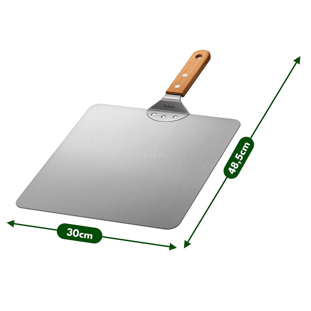 Łopata do pizzy 30 cm Kuketo to narzędzie stworzone z myślą o wygodnym wyjmowaniu pizzy z piekarnika, kamienia lub pieca. Kwadratowy kształt powierzchni roboczej ułatwia podbieranie zarówno cienkiego ciasta, jak i bardziej puszystych wypieków neapolitańskich. Stal nierdzewna o gładkiej fakturze zmniejsza tarcie, dzięki czemu pizza łatwo przesuwa się po łopacie. Pozwala to zwiększyć komfort pieczenia i nadaje pracy w kuchni profesjonalny charakter.