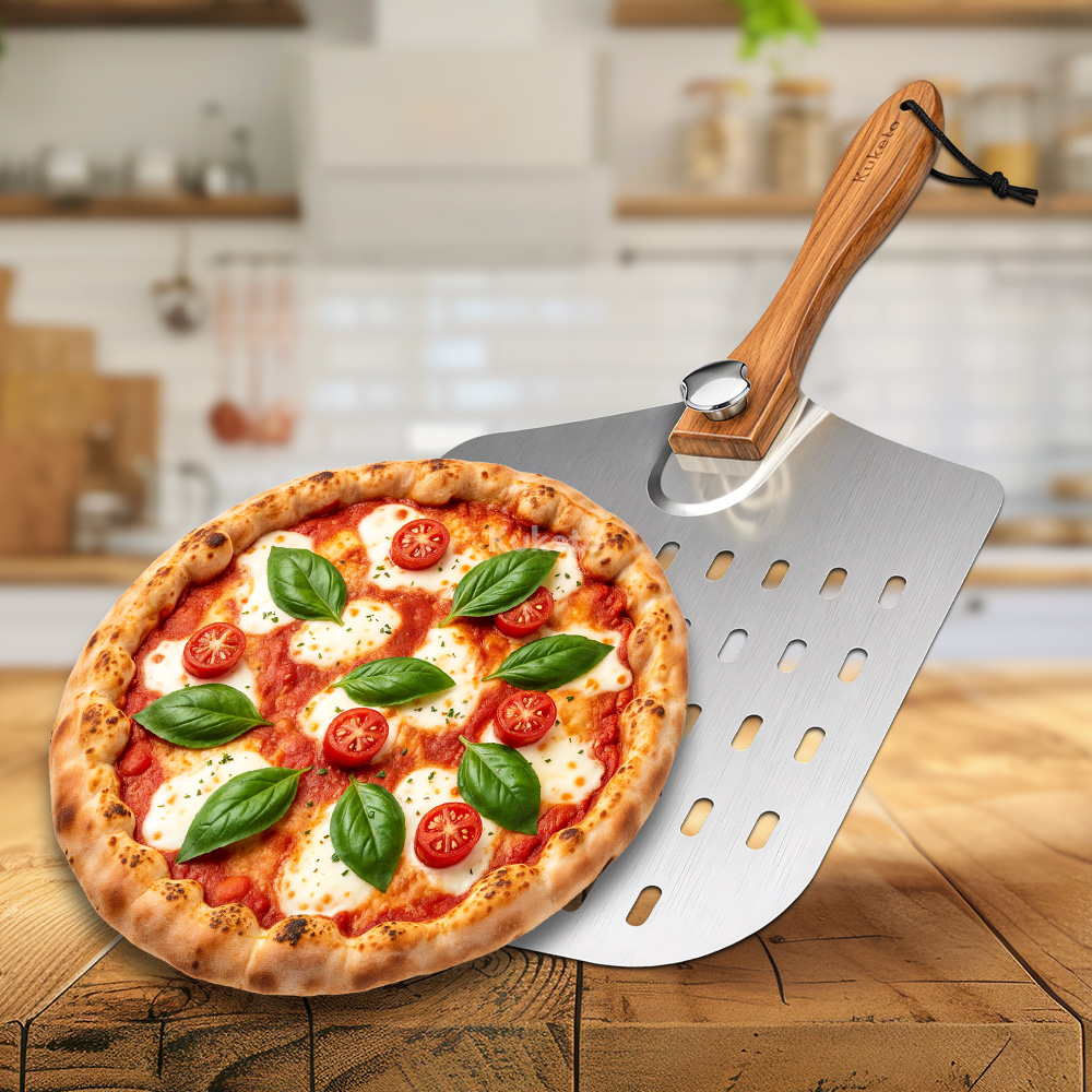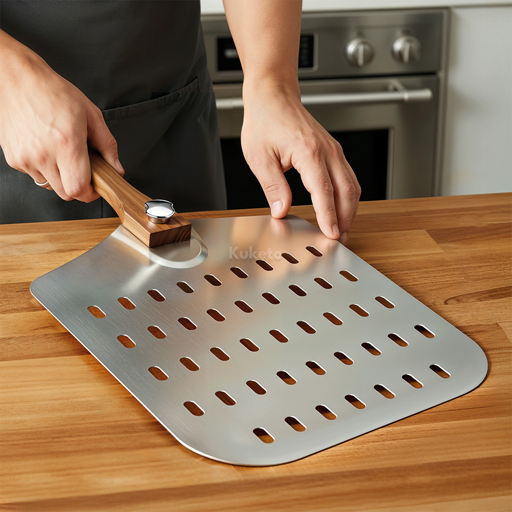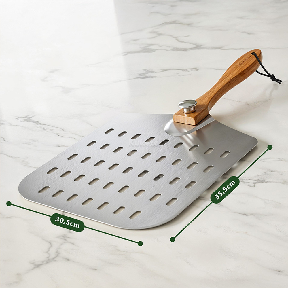 Łopata do pizzy perforowana ze składaną rączką marki Kuketo wykonana jest z wysokiej jakości stali nierdzewnej, odpornej na korozję i wysokie temperatury. Jej trwała konstrukcja zapewnia długowieczność, a zaostrzona krawędź ułatwia nabieranie pizzy bez uszkodzenia ciasta. Drewniany uchwyt dodaje elegancji i komfortu, a perforowana powierzchnia sprawia, że jest łatwa do utrzymania w czystości. Łopatka idealnie nadaje się do użytku domowego oraz profesjonalnego, a jej funkcjonalność można rozszerzyć na inne wypieki, takie jak chleb czy domowe ciasta. Na pewno znajdziesz dla niej zastosowanie w swojej kuchni!