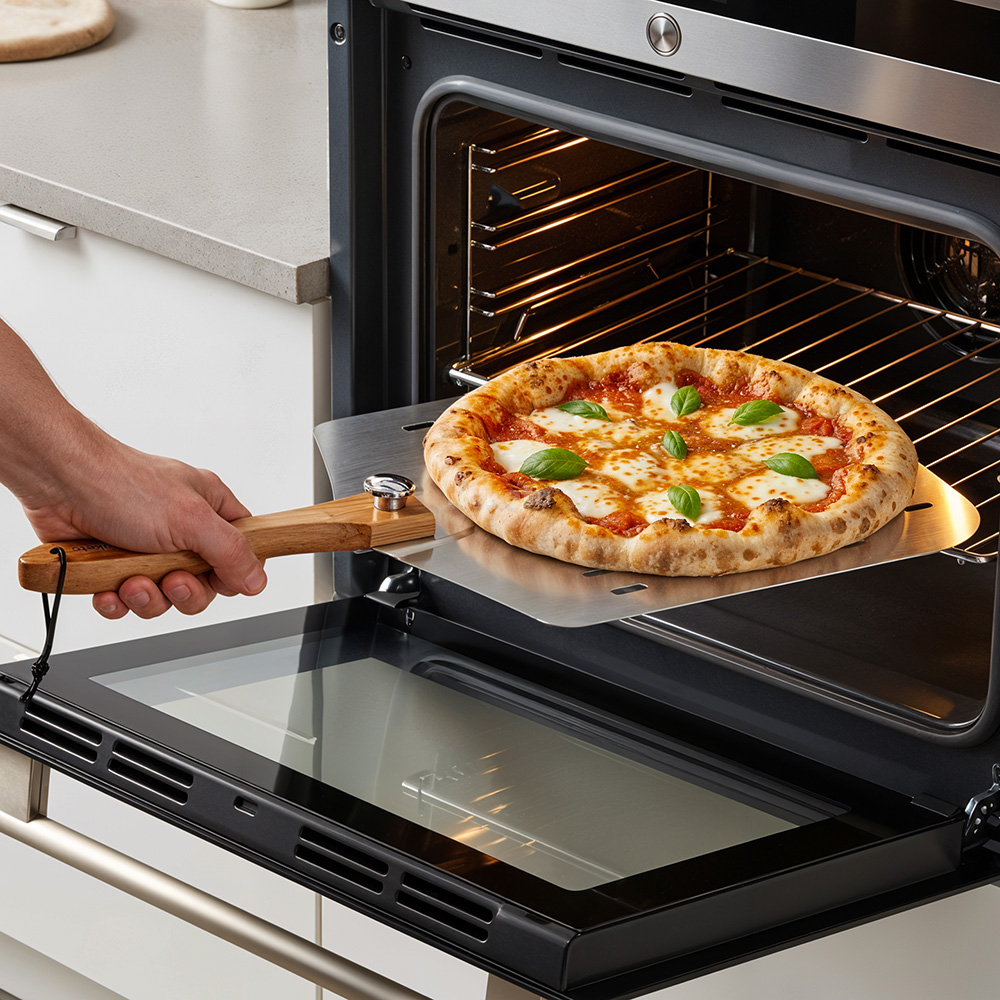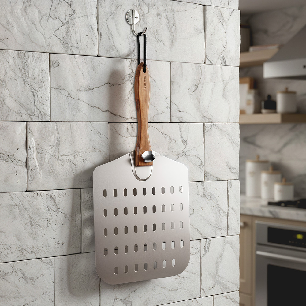 Łopatka do pizzy Kuketo to wszechstronne narzędzie, które doskonale sprawdza się w każdym typie pieca – od tradycyjnych pieców opalanych drewnem, po piekarniki elektryczne i gazowe. Dzięki swoim wymiarom umożliwia łatwe manewrowanie nawet większymi pizzami. Składana, drewniana rączka zapewnia nie tylko wygodę użytkowania, ale także bezpieczeństwo. Nie nagrzewa się, dzięki czemu minimalizuje ryzyko poparzeń podczas pracy w kuchni. Co więcej, łopatę można złożyć, co pozwala zaoszczędzić miejsce podczas przechowywania. Ta profesjonalna, perforowana łopatka do pizzy to niezbędne narzędzie dla każdego pizzermana.