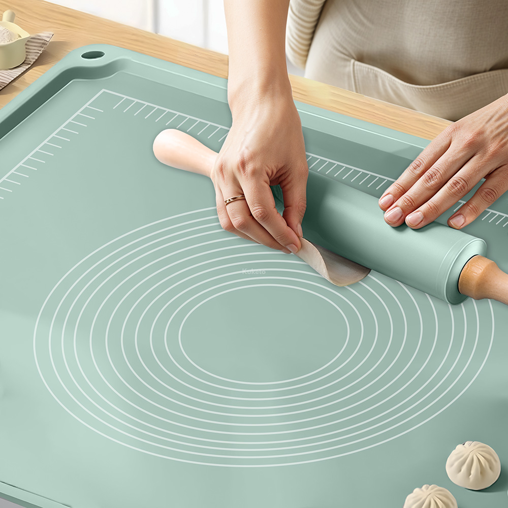 Mata silikonowa stolnica 70×50 z rantem to praktyczny i nowoczesny zestaw 12 akcesoriów kuchennych, który ułatwia pieczenie i gotowanie na co dzień. Dzięki dużej powierzchni oraz elastycznemu silikonowi idealnie sprawdza się do wałkowania ciasta, lepienia pierogów czy przygotowywania ciasteczek. Stolnica silikonowa z rantem zapewnia czystość blatu i komfort pracy, a jej antypoślizgowa struktura zapobiega przesuwaniu się podczas użycia. W zestawie znajduje się wszystko, czego potrzeba do domowych wypieków – wałek, pędzelek, trzepaczka, szpatułki, łyżki i miarka. Co więcej, miętowy kolor zestawu wprowadza do kuchni świeżość i styl.