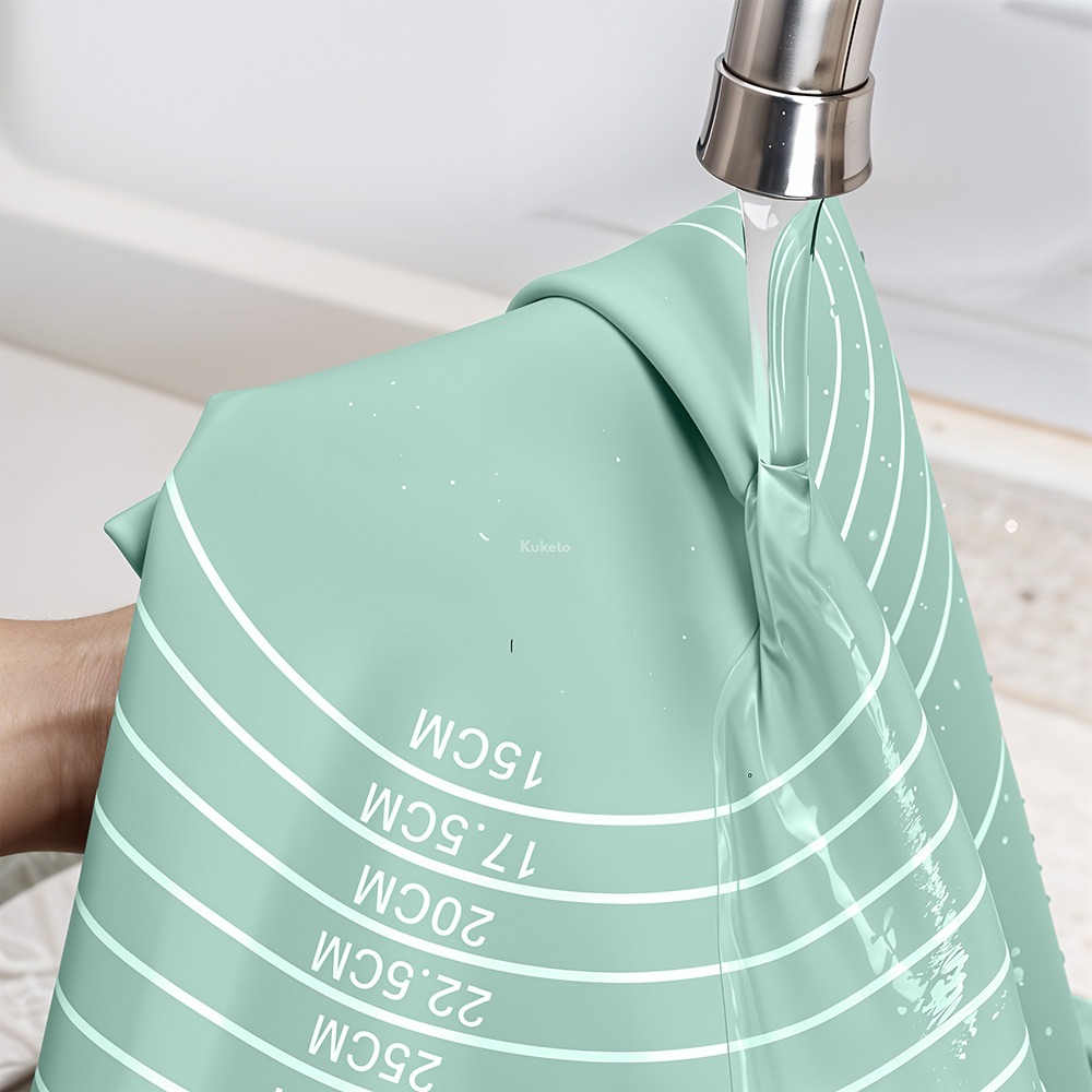 Ta mata silikonowa stolnica 70×50 z rantem to nie tylko wygoda, ale też praktyczność. Po użyciu można ją zwinąć w rulon i schować w szufladzie, dlatego zajmuje bardzo mało miejsca. Co więcej, mata jest odporna na przywieranie i niezwykle łatwa w czyszczeniu – wystarczy przetrzeć ją wilgotną ściereczką lub włożyć do zmywarki. Wysoki rant chroni blat przed rozsypaną mąką i rozlanym ciastem, dzięki czemu utrzymanie porządku staje się znacznie prostsze. Antypoślizgowy spód gwarantuje stabilność, natomiast nadrukowana miarka w centymetrach i okręgach pozwala wałkować ciasto z pełną precyzją.