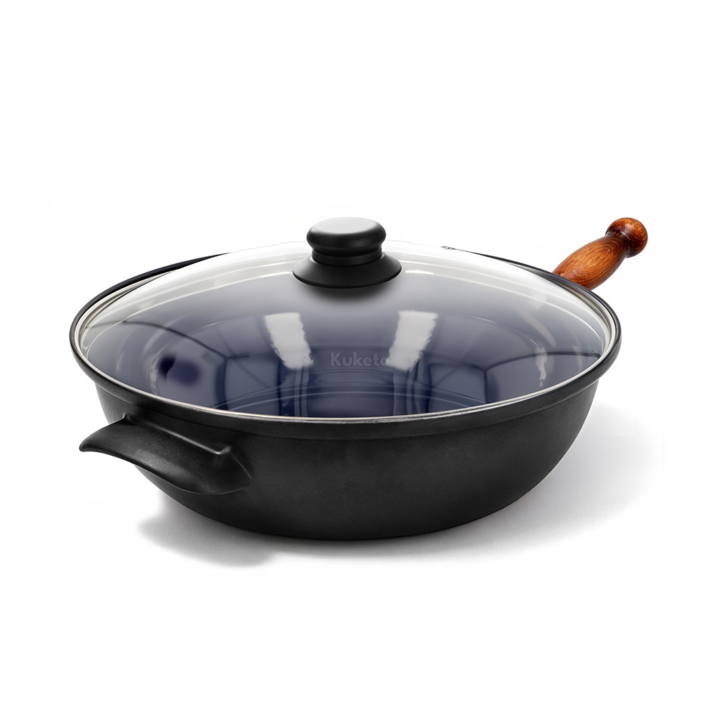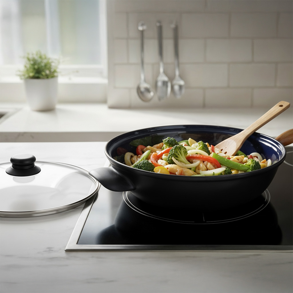 Do zestawu dołączona jest dopasowana pokrywa, która pozwala kontrolować proces gotowania i ograniczyć utratę ciepła. Co istotne, uchwyty patelni są solidne i stabilne, dlatego przenoszenie naczynia jest bezpieczne nawet przy pełnym załadunku. Patelnia nadaje się do kuchenek gazowych, elektrycznych i ceramicznych, a po zdjęciu pokrywy można używać jej także w piekarniku.