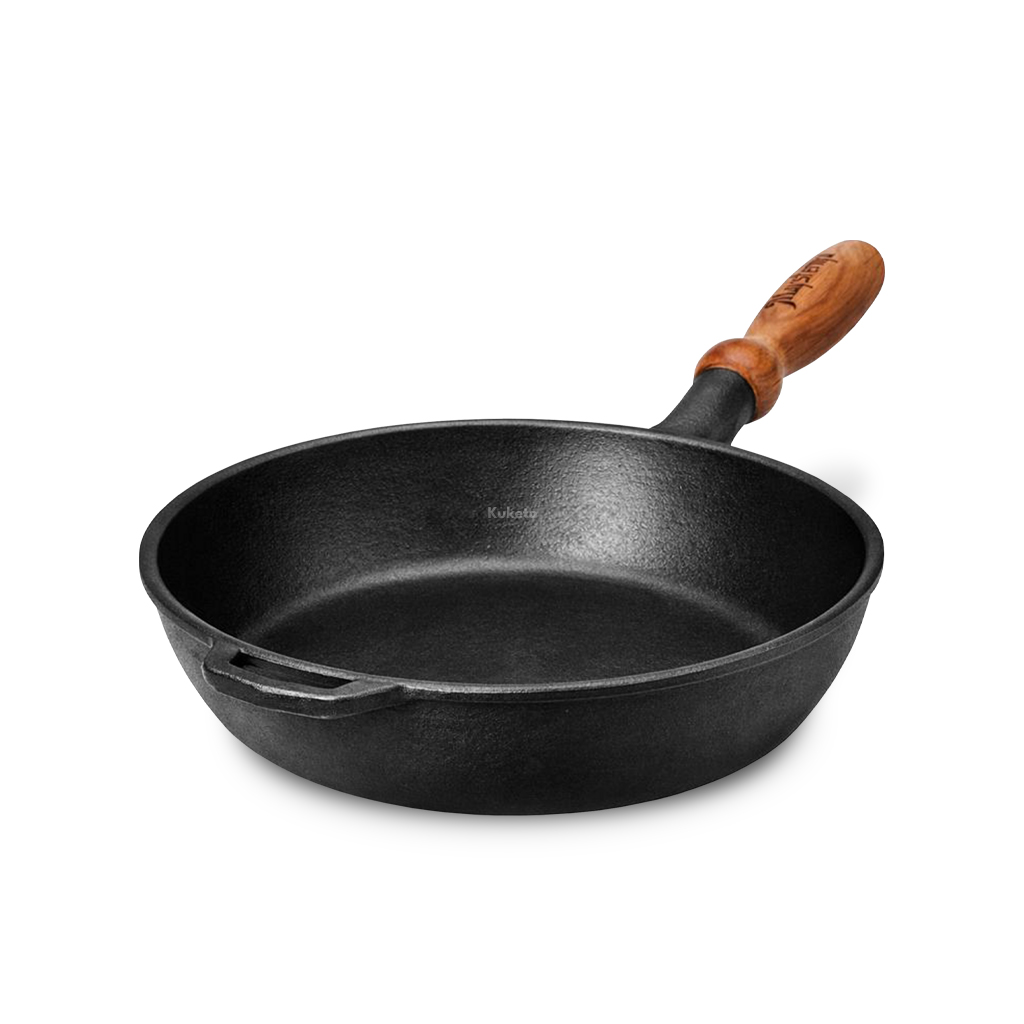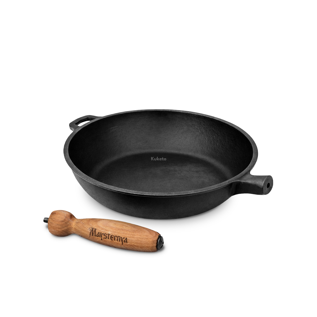 Patelnia 24 cm Maysternya – żeliwna patelnia z odkręcaną, drewnianą rączką. Patelnia ma rączkę i specjalny uchwyt, który ułatwia podniesienie pełnej, ciężkiej patelni. Głęboka patelnia doskonale sprawdzi się do przygotowania dań jednogarnkowych. Patelnia z drewnianą się rączką to bezpieczeństwo i wygoda użytkowania. Patelnię bez rączki można ułożyć na ruszcie grilla, włożyć do piekarnika.