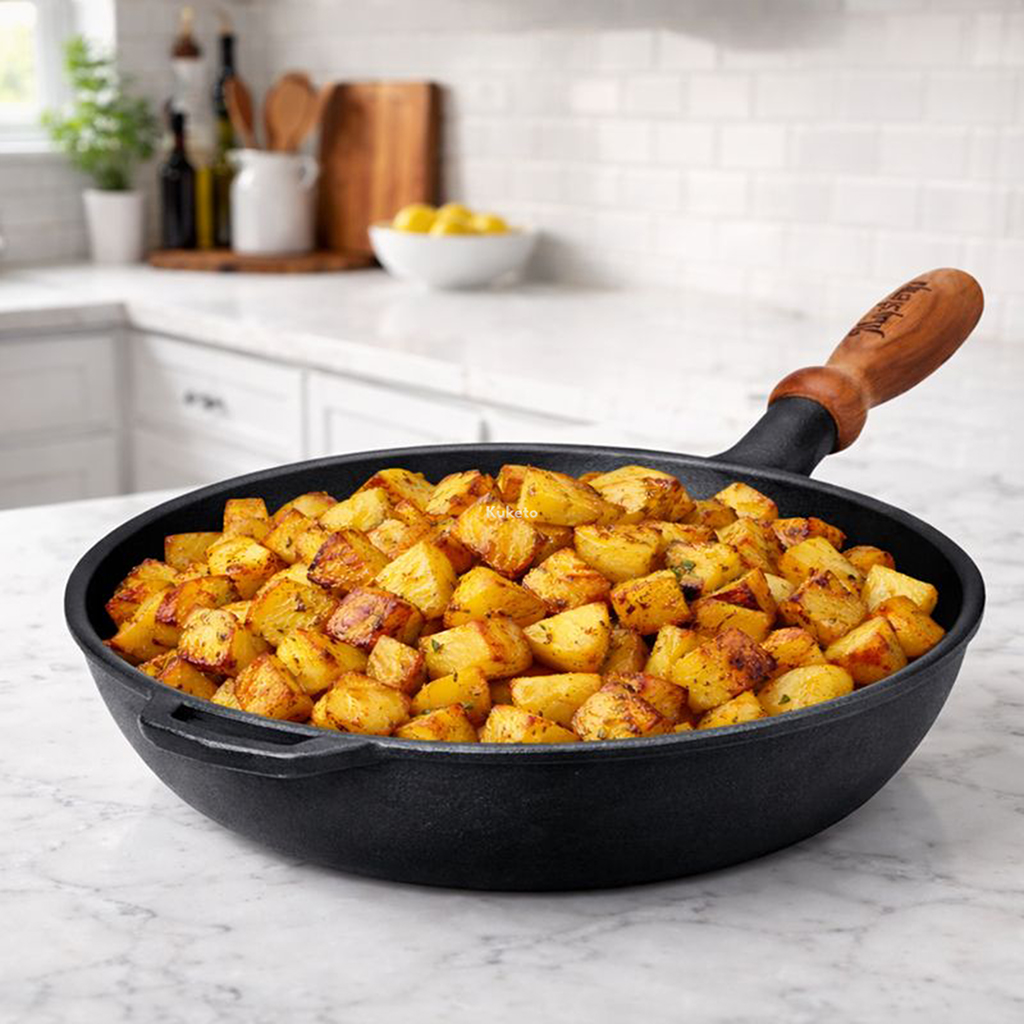 Patelnie żeliwne działają na każdym rodzaju kuchni. To patelnie na gaz, na kuchenki elektryczne, ceramiczne. Doskonale sprawdzą się także jako patelnia na indukcję. Wstępne kalcynowanie zapewnia naturalną powłokę, pozwala na smażenie i pieczenie z mniejszą ilością tłuszczu. Patelnia żeliwna nie boi się metalowych mieszadeł, ani widelca, którym odskrobiemy zapieczone smakołyki. Jest niezwykle trwała i zapewne będzie służyć w kuchni przez kilka pokoleń.