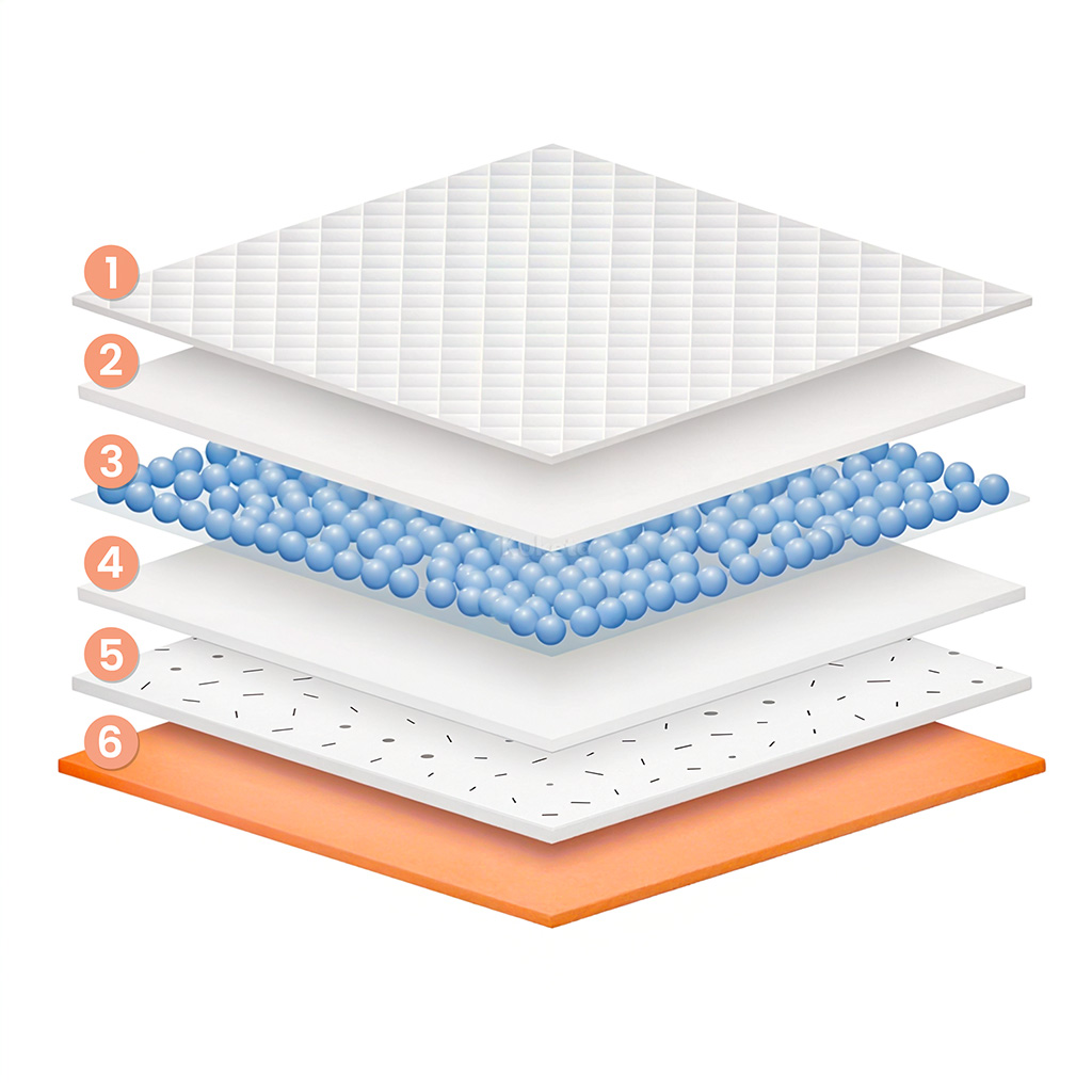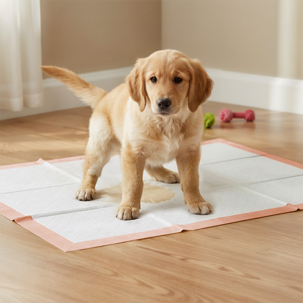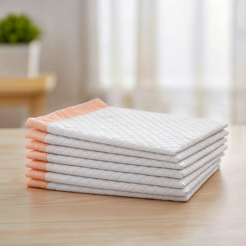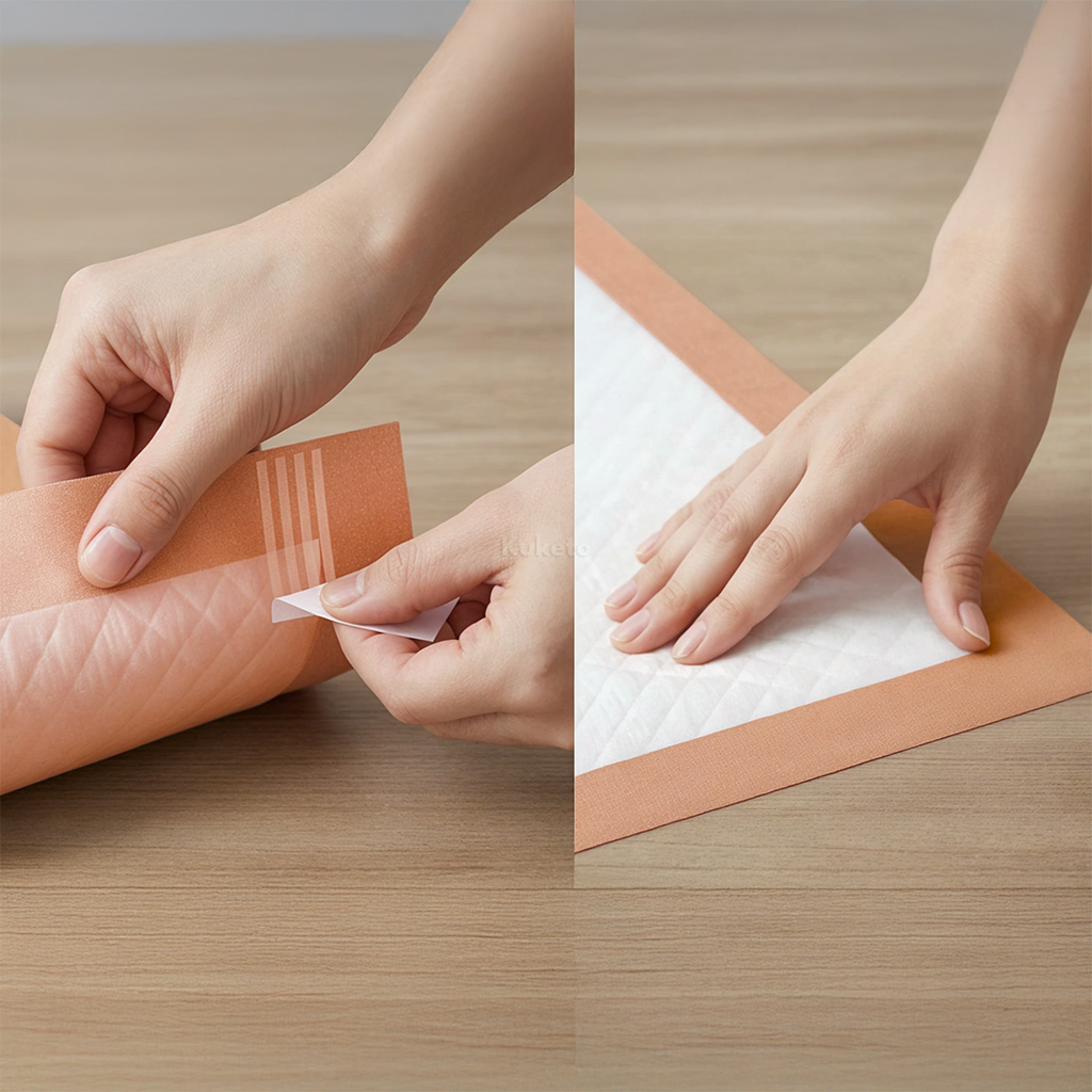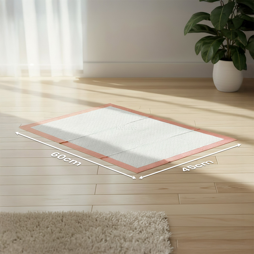 Każdy podkład o wymiarach 45×60 cm posiada sześciowarstwową konstrukcję, która skutecznie zatrzymuje wilgoć i zapachy. Miękka włóknina wierzchnia szybko przyjmuje płyn i pozostaje przyjemna dla łap psa. Wewnętrzny wkład chłonny z pulpy celulozowej i żelu SAP wiąże wilgoć, dzięki czemu powierzchnia maty pozostaje sucha. Dodatkowo nieprzemakalna warstwa spodnia z folii PE chroni podłogę, dywan lub legowisko przed przesiąkaniem.