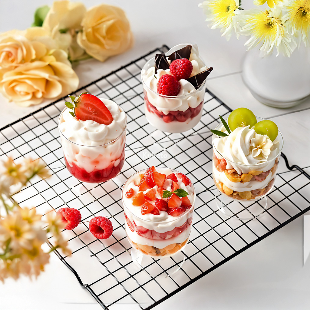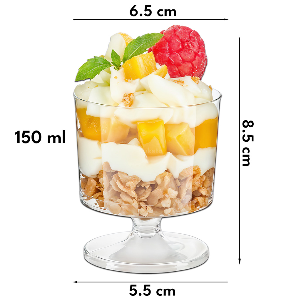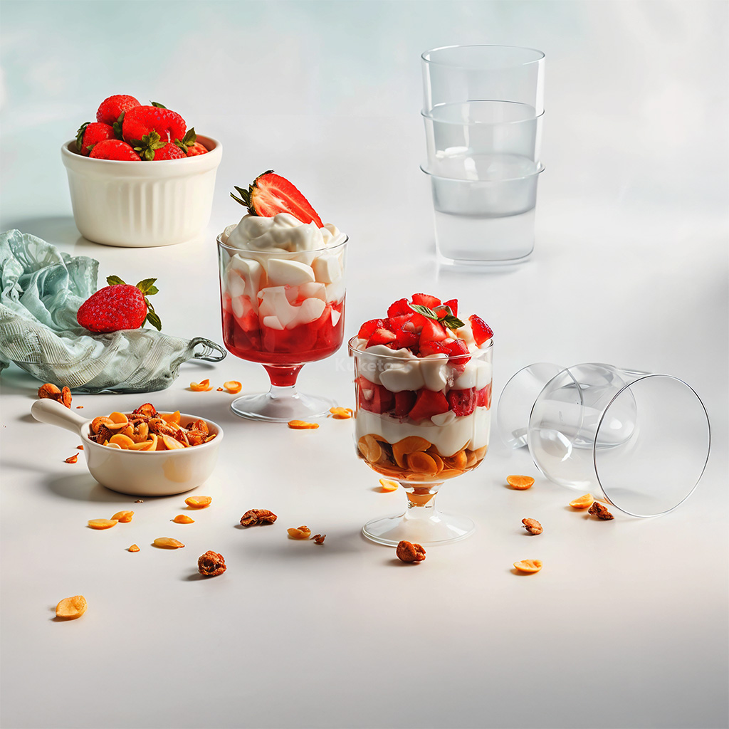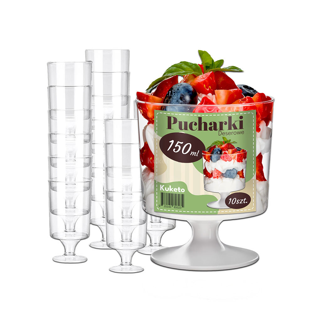 Pucharki plastikowe do deserów marki Kuketo to eleganckie i funkcjonalne naczynia idealne do serwowania rozmaitych przekąsek. Ich okrągły kształt, przezroczyste ścianki oraz subtelna nóżka nadają im wyjątkowy wygląd, który doskonale komponuje się z różnymi aranżacjami stołu. Pojemność 150 ml pozwala na podanie różnorodnych smakołyków – od lodów i musów, przez monoporcje i sałatki owocowe, aż po orzeszki i suszone owoce. Pucharki zostały wykonane z wysokiej jakości tworzywa sztucznego, które perfekcyjnie imituje szkło, zachowując przy tym lekkość i odporność na stłuczenia. Dzięki temu są bezpieczne w użytkowaniu, nawet na przyjęciach z udziałem dzieci.