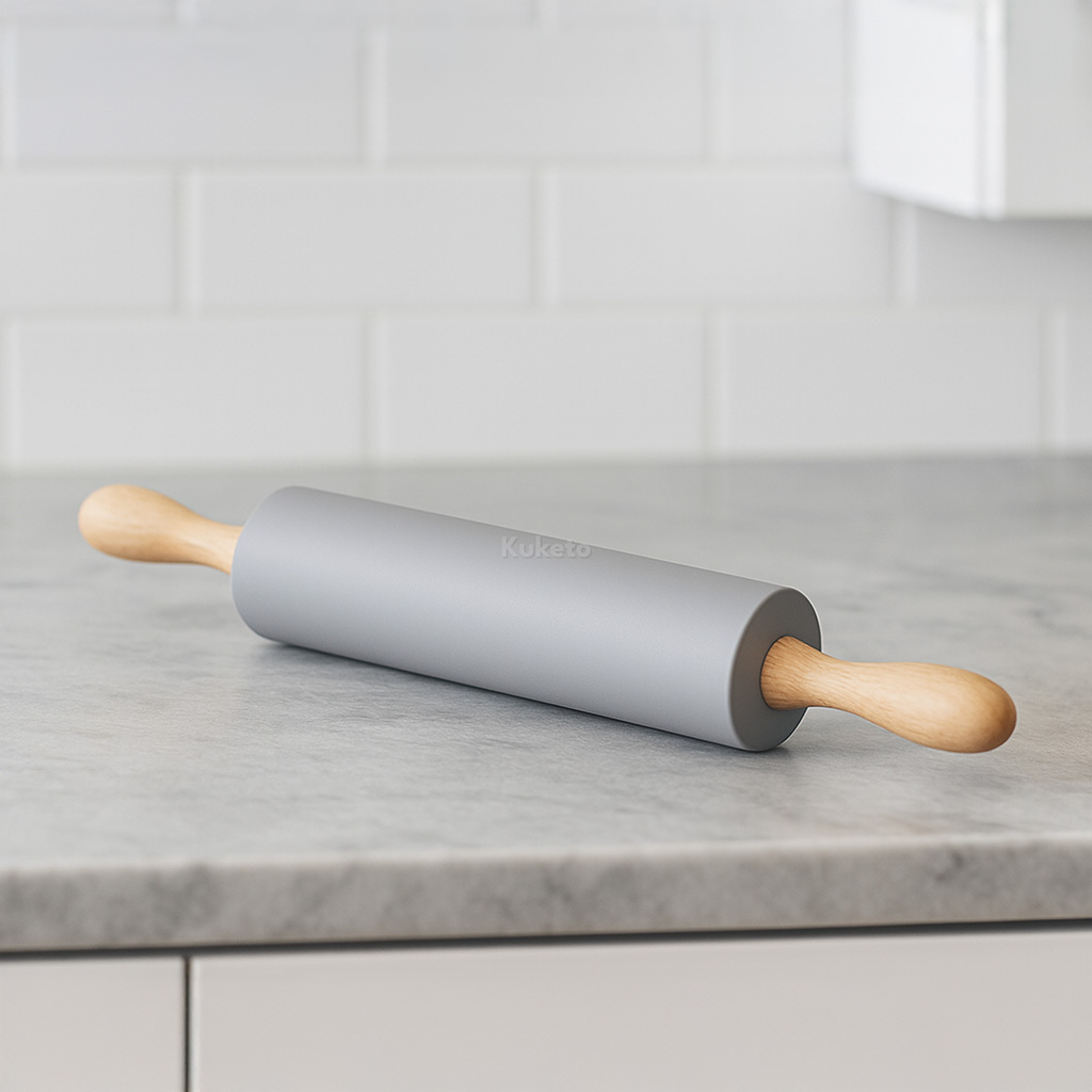 W zestawie znajduje się silikonowy wałek o długości 38 cm, który został wyposażony w drewniane uchwyty, dlatego zapewnia stabilny i wygodny chwyt. Wałek jest lekki oraz higieniczny, a jednocześnie nie przykleja się do ciasta, dzięki czemu znacząco ułatwia pracę. Obracająca się środkowa część pozwala na równomierne wałkowanie, natomiast materiał odporny na zapachy zwiększa komfort użytkowania. W efekcie komplet łączy wygodę, precyzję oraz estetykę, dlatego przygotowywanie wypieków staje się prostsze i bardziej przyjemne.