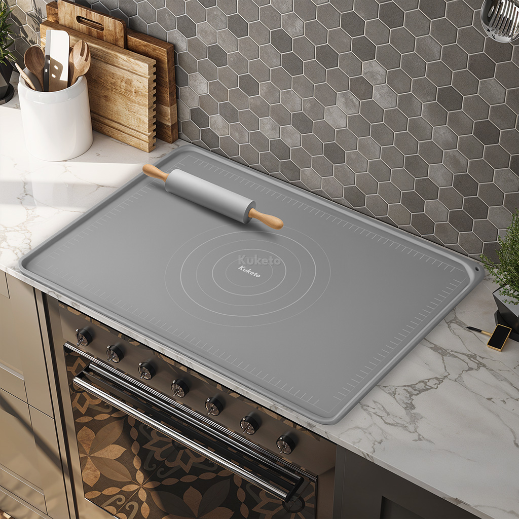 Dzięki bardzo dużej powierzchni stolnica idealnie sprawdzi się podczas przygotowywania pizzy XXL, makaronu, pierogów czy ciasta drożdżowego. Ponieważ jest odporna na temperaturę i elastyczna, może pełnić także funkcję ochronnej podkładki na blat. To praktyczne rozwiązanie, które łączy wygodę oraz estetykę z wysoką wytrzymałością, a jednocześnie ułatwia utrzymanie czystości w kuchni. Dlatego zestaw stanowi niezbędny element wyposażenia każdego, kto lubi piec i ceni komfort pracy.