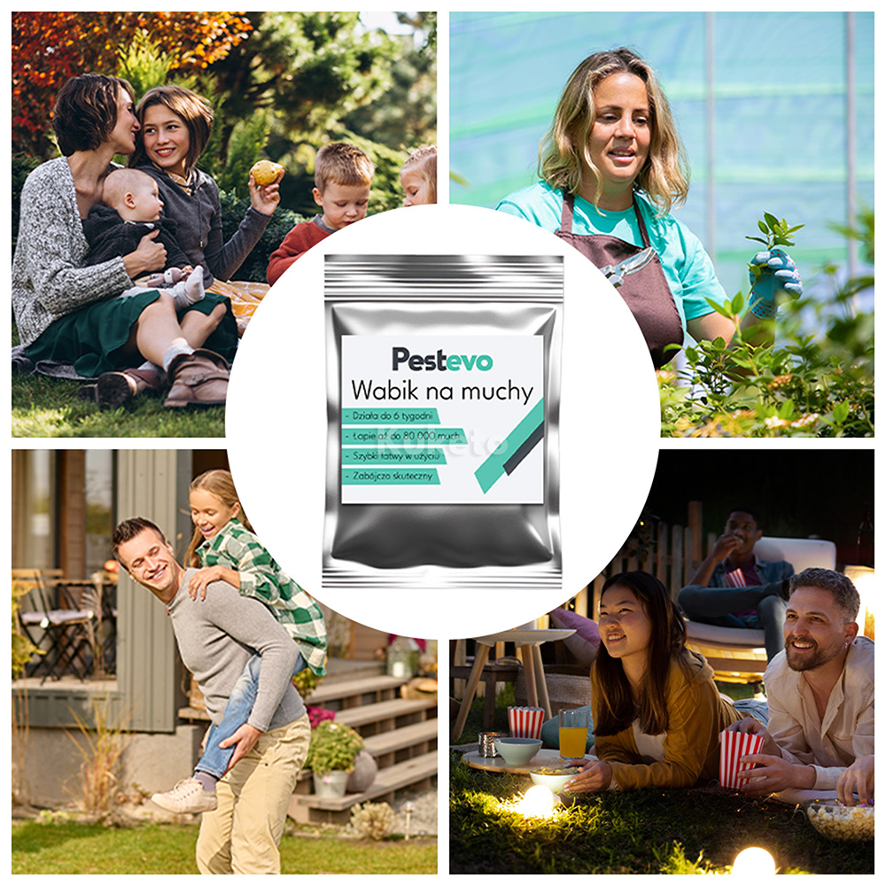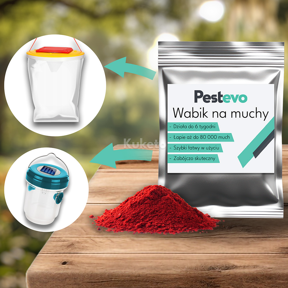 Stosowanie wabika jest łatwe i nie wymaga doświadczenia. Produkt sprawdzi się w domach, na działkach oraz w gospodarstwach, ponieważ wystarczy wsypać zawartość saszetki do pojemnika i zalać wodą. Jedna dawka zwabia nawet 80 000 owadów, a skuteczność utrzymuje się przez wiele tygodni. Dzięki temu nie trzeba często wymieniać pułapki, co oszczędza czas i pieniądze.