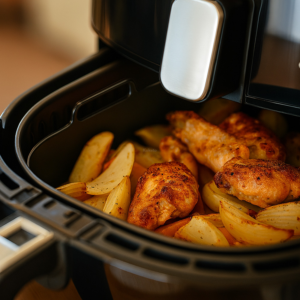 Używanie wkładu silikonowego Kuketo znacząco ułatwia przygotowywanie posiłków. Dzięki specjalnej strukturze dna powietrze swobodnie cyrkuluje wokół potrawy, a jedzenie piecze się równomiernie. Dzięki temu frytki wychodzą chrupiące, a mięso i warzywa zachowują soczystość. Co więcej, silikonowa forma zapobiega przywieraniu i ułatwia czyszczenie – po skończonym gotowaniu wystarczy umyć wkład ręcznie lub włożyć go do zmywarki. To koniec problemu z resztkami przypalonego jedzenia i trudnym szorowaniem koszyka frytkownicy.